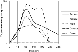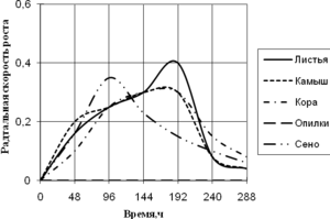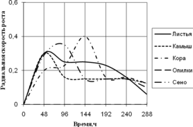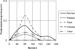 На основании полученных данных составляли графики зависимости радиальной скорости роста исследуемых штаммов от времени, определяли способность исследуемых штаммов использовать в качестве единственного источника углерода природные растительные материалы (камыш, сено, растительный опад, опилки, кора).
