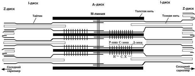 Сократительным аппаратом мышечной клетки является миофибрилла, которая состоит из наименьших сократительных единиц – саркомеров. Саркомеры расположены друг за другом вдоль оси миофибриллы. Каждый саркомер содержит упорядоченную систему цитоскелетных и сократительных белков и имеет длину 2.5–3.0 мкм (Squire, 1981; Шубникова и др. 2001). Основными сократительными белками саркомера являются миозин, актин и тайтин. Молекулы актина образуют тонкие (актиновые) нити, в состав которого входят также тропомиозин и тропонин. Толстые нити скелетных мышц кроме миозина содержат также другие белки, такие как тайтин, С-белок, Х-белок, Н-белок и др. (рис. 1).