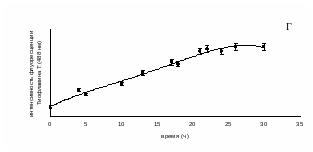 Рис. 20. А – аморфные агрегаты Х-белка (4 часа диализа), Б – линейные фибриллы и аморфные агрегаты Х-белка (17 часов диализа), В – спирально скрученные ленточные фибриллы Х-белка (22 часа диализа), сформированные в растворе, содержащем 30 мМ KCl, 10 мМ имидазола, рН 7.0. Негативное окрашивание 2% раствором уранилацетата. Шкала 100 нм. Г – скорость образования амилоидных фибрилл Х-белка.
