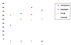 Вченими встановлено неоднозначність можливих шляхів формування відповідних реакцій організму протягом 14 доби на дію з гербіцидів, про що свідчить різна динаміка гематологічних показників двухлеток коропа (мал.1).