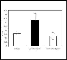 Результаты исследования показали, что содержание нитрит-иона в сыворотке крови онкологических больных до проведения им химиотерапии уменьшается по сравнению с контрольной группой на 19,4 %. После проведения химиотерапии концентрация нитрит повышается по отношению к периоду до лечения на 12 %, но остается ниже контрольных значений на 8,4 % (рис.3).
