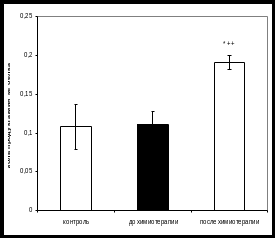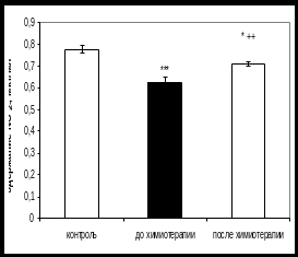 Рис. 2. Активность АПФ у онкологических больных при химиотерапевтическом воздействии (нмоль продукта, образовавшегося за 1 мин инкубации на 1 мг белка, Mm, n=1218; достоверность отличий: * - p< 0,05 относительно контроля; ++ - p< 0,01 относительно до химиотерапии).