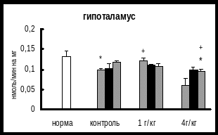 При этом в контрольной группе животных активность фермента в гипофизе через 0,5 и 4 часа была выше по сравнению с нормой, а через 18 часов возвращалась к исходному уровню. В то же время при введении этанола в дозе 1 г/кг зависимость от времени после инъекции не наблюдалась и активность КПН достоверно не отличалась от нормы. При введении этанола в дозе 4 г/кг активность фермента имела тенденцию к снижению к 4 часам, к 18 часам наблюдалось повышение активности фермента.