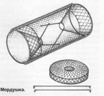 Лов мордушками. Мордушка представляет собой цилиндр из металлической сетки с ячеей 4045 мм, имеющий один или два направленных внутрь конусовидных входа. Размеры и конструкции мордуши варьируют в зависимости от условий эксплуатации: длина 600-1000 мм, диаметр 250-500 мм (рисунок 12).