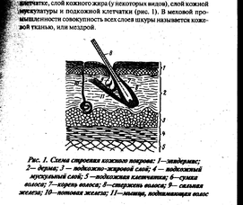 В кожном покрове различают несколько слоёв: эпидермис, или наружный слой; дерму, или средний; внутренний, прилегающий к телу животного- жировому слою, или подкожной клетчатке, слой кожного жира, слой кожной мускулатуры и подкожной клетчатки (рисунок 13). В меховой промышленности совокупность всех слоёв шкуры называется кожевой тканью, или мездрой.