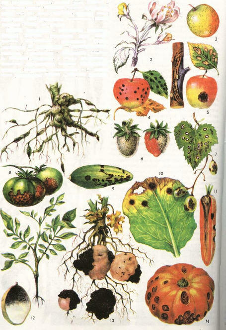 Болезни растений: 1 – кила капусты, 2 – мучнистая роса яблони, 3 – лептотириоз плодов яблони, 4 – парша яблони, 5 – черный рак яблони, 6 – серая гниль земляники, 7 – антракноз винограда, 8 – фитофтороз томата, 9 – бактериоз огурца, 10 – альтернариоз капусты, 11 – черная гниль моркови, 12 – черная ножка картофеля, 13 – рак картофеля, 14 – антракноз тыквы.