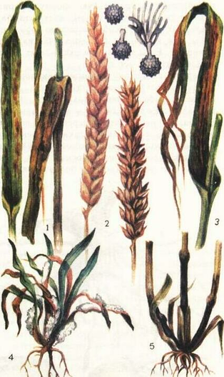 Болезни растений: 1 – бурая ржавчина пшеницы и ржи; 2 – головня пшеницы (слева – здоровый колос, вверху – головневые споры); 3 – полосатая пятнистость ячменя; 4 – снежная плесень; 5 – стебли пшеницы, пораженные афиоболезом; 6 – мучнистая роса з