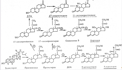 Завдяки зусиллям багатьох дослідників біосинтез кортикостероїдів вивчений порівняно повно. Першою стадією кортикостероїдогенезу є перетворення вихідного продукту – холестерину в прегненолон, який потім перетворюється в прогестерон. Якщо прогестерон першочергово піддається гідроксилюванню з 21-го атома вуглецю, то кінцевим продуктом буде кортикостерон. З 17-оксипрогестерону і 17-оксипрегненолону утворюються андрогени. Попередником альдостерону є кортикостерон. В процесі утворення кортикостероїдів використовується велика кількість НАДФ * Н, який утворюється завдяки посиленому обміну глюкози в наднирниках в пентозному циклі.