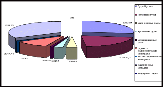 По данным таблицы 2 видно, что валовая потенциальная стоимость минерального сырья довольно велика по всем видам минерального сырья. Несмотря на большой потенциал бурого угля по стоимости он уступает благородным металлам, которые в свою очередь оценены в 165723 млн. долларов притом, что для платиновой группы не учитывался металлогенический потенциал, ввиду его громадной валовой стоимости. Наименьшую стоимость имеет кварцевое сырье 381 млн. долларов, в связи с его небольшими запасами. Более наглядно стоимостная оценка минерально-сырьевого потенциала представлена на рисунке 1.