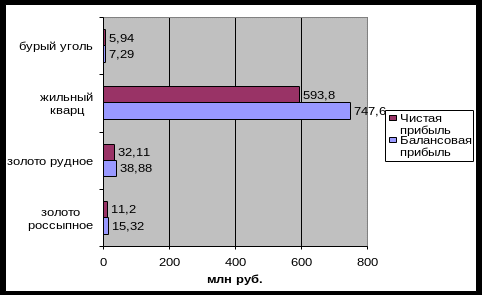 Ниже в таблице 3 приводятся результаты оценки отдельных месторождений и видов полезных ископаемых. Экономические показатели приведены за 2007 год и наглядно показаны на рисунках 2, 3 и 4. Расчет экономических показателей проводиться по следующим формулам: