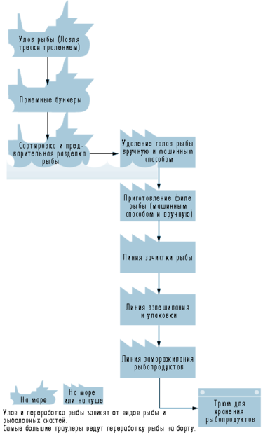 Технический прогресс в замораживании и переработке рыбы на борту рыболовных судов оказал также большое воздействие на рыбоперерабатывающие заводы, работающие в прибрежной зоне. Организована автоматическая и в то е время гибкая система производственных участков, где можно изучить качество выпускаемой продукции, провести эксплуатационные испытания технологического оборудования и оценить выработку продукции по индивидуальным заказам с целью определения оптимальной системы управления производственными процессами.