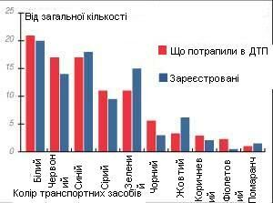 Зв'язку між тим, які автомобілі найбільш часто стають учасниками аварій: вітчизняні або імпортні машини не виявлена. Так із загального числа ДТП із важкими наслідками 23 % - це імпортні машини, але й зареєстрованих «іномарок» у Дніпропетровській області також близько 30%. Спостерігається також зв'язок між кольором транспортного засобу (ТЗ) та аварійністю на дорогах. ( Рис 2.2.). З графіка видно, що найбільш аварійні ТЗ білого, червоного, та синього кольорів. Це пояснюється специфікою людського зору [32].