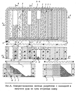 Участок рудной залежи в пределах панели шириной 120-150 м, длиной 200-250 м разбивают на первичные и вторичные камеры шириной 15,5-16,0 м. Вначале отрабатывают первичные камеры, которые затем заполняют твердеющей закладкой прочностью 40-60 кгс/см2. После того, как закладка приобретет необходимую прочность (в течение 6 мес), начинают очистную выемку во вторичных камерах. Вторичные камеры после отработки заполняют твердеющей или гидравлической закладкой.