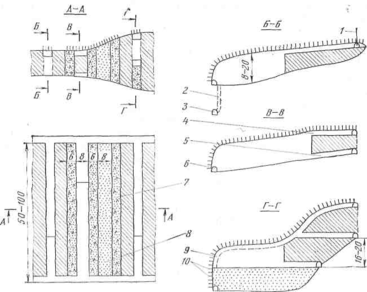 В породах кровли залежи проходят закладочный горизонт. Закладочные штреки 6 сечением 6,4 м2 сбивают с первичными камерами восстающими 7 сечением 5 м2. В конце панели с вентиляционного штрека проходят вентиляционный восстающий 8 сечением 10 м2, которым сбиваются транспортно-буровой, буровой и закладочный горизонты. Отработку первичных камер начинают с образования отрезной щели путем взрывания вертикальных скважин на отрезной восстающий 9 сечением 6,7 м2. После образования отрезной щели руду отбивают взрыванием вееров скважин диаметром 52 мм, расстояние между веерами 1,3-1,5 м. Руду выпускают в погрузочные заезды и грузят погрузочными машинами ПНБ-4 в автосамосвалы. Вторичные камеры отрабатывают после закладки первичных и по высоте делят на 2-3 слоя. Нижний слой по мощности должен быть таким, чтобы обеспечить шпуровую отбойку при его отработке (4-5м). Остальные слои отрабатывают путем скважинной отбойки, высота их 10-15 м.