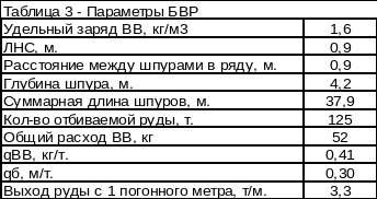 30 м и шириной 6—8 м. Диаметры скважин на отбойке составляют 52, 65, 80 и 105 мм, выход руды 3—5,5 м3/м, удельный расход ВВ 1,2—1,6 кг/м3.