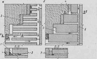 выработанного пространства: а и б — соответственно планы погрузочно-транспортного и бурозакладочного горизонтов; 1 и 2 — соответственно камеры в стадии очистной выемки и затвердевания закладки; 3 — погрузочно-транспортный комплекс; 4 и 5 — соответственно камеры в стадии нагнетания аакладки и подготовки; 6 — закладочный трубопровод; 7 — перемычка из отбитой руды.