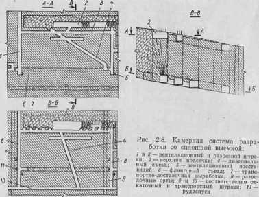 Очистные работы производят в камерах, расположенных ступенчато, параллельно фронту очистной выемки. Разбуривание массива и подача закладки осуществляются через выработки верхней подсечки. Погрузочно-доставочные орты в нижней подсечке соединяют через 80—120 м транспортным штреком с рудоспуском.