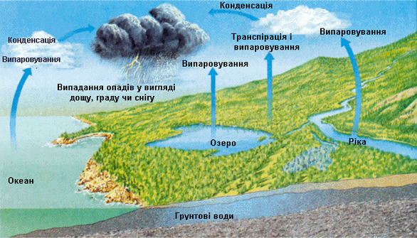 Усереднена для всієї земної кулі швидкість випаровування складає біля 2,5 мм у добу. У цілому вона урівноважена величиною середньоглобальної кількості атмосферних опадів (біля 914 мм/рік). Сумарний запас водяної пари в атмосфері еквівалентний приблизно 25 мм опадів, так що в середньому він обновляється кожні 10 днів. Водяна пара виноситься нагору і поширюється в атмосфері повітряними потоками різних розмірів – від локальних конвективних плинів до глобальних систем вітрів (західний перенос або пасати). У міру того як тепле вологе повітря піднімається нагору, воно розширюється в результаті зниження тиску у високих шарах атмосфери і охолоджується. Унаслідок цього відносна вологість повітря підвищується доти, поки повітря не досягне стану насичення водяною парою. Подальший його підйом і охолодження приводять до конденсації надлишкової вологи на дрібних зважених у повітрі частках і до утворення хмар, що складаються з крапельок води. Усередині хмар ці крапельки діаметром усього лише біля 0,1 мм падають дуже повільно, але не усі вони однакового розміру. Більш великі краплі падають швидше, обганяючи зустрічні на їхньому шляху більш дрібні, зіштовхуються і зливаються з ними. У такий спосіб більш великі краплі ростуть за рахунок приєднання дрібних. Якщо крапля в хмарі проходить відстань біля 1 км, вона може стати досить важкою і випасти з нього дощовою краплею. Дощ може утворюватися й інакше. Краплі у верхній, холодній частині хмари можуть залишатися рідкими навіть при температурі набагато нижче 0° С – звичайної точки замерзання води. Такі краплі води, що звуться переохолодженими, здатні змерзнути, тільки якщо в них впроваджуються особливі частки, що є ядрами льодоутворення. Замерзлі краплі розростаються в крижані кристали, а кілька крижаних кристалів можуть об'єднатися й утворити сніжинку. Сніжинки проходять крізь хмару й у холодну погоду досягають землі у виді снігу. Однак у теплу погоду вони тануть і досягають поверхні у формі дощових крапель. Кількість атмосферних опадів, що досягають поверхні землі в даному місці у вигляді дощу, граду або снігу, оцінюється товщиною шару води (у міліметрах). Він вимірюється спеціальними приладами – осадомерами, що звичайно розташовуються на відстані в кілька кілометрів один від іншого і фіксують кількість опадів за визначений проміжок часу, звичайно за 24 год [2].