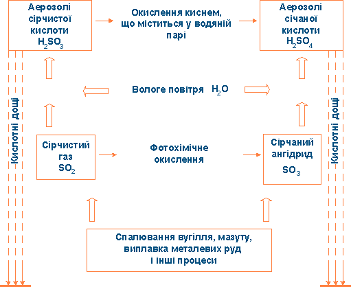 Діоксид сірки, що потрапив в атмосферу, перетерплює ряд хімічних перетворень, що ведуть до утворення кислот.