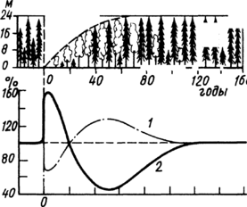 Доказательства изменения испарения и стока привел О. И. Крестовский на примере вырубки и восстановления елового леса (рис. 7) [ 22, с. 194 ]. В первое десятилетие после вырубки леса испарение резко снижается (на 20—35%), так как надпочвенная растительность, оставшаяся после вырубки спелого елового леса, не требует большого количества влаги.