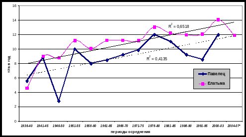 Видовая структура сообществ – достаточно консервативный параметр, откликающийся на климатические изменения со значительным запаздыванием, в отличие от первичной биопродуктивности. Как следует из данных рисунка 3.4.4, начиная с середины XX века, наблюдается значительный рост продуктивности зональных сообществ, наиболее значительный в ландшафтах Мещеры. При этом в настоящее время прирост достиг значений, типичных для западноевропейских широколиственных лесов (12 – 14 т/га, что примерно на 1/3 выше зональной нормы).