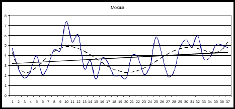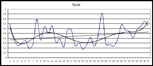 Интенсивность водообмена в бассейнах рек за изучаемый период, линейный и полиномиальный тренды