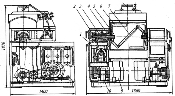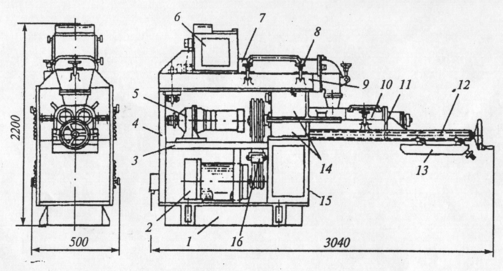 Общий вид машины приведен на рисунке 1.3. Станина машины собрана из чугунных плит 1, 3, 4, 15, которые скреплены с чугунными корпусами редуктора 5 и смесительной камеры 9. На плите 1 укреплен электродвигатель 2, а на плите 3 – мотор редуктор 5, натяжной ролик 16 и редуктор 14. Для удобства очистки камера предварительного смешения снабжена откидной крышкой 7 с петлями и винтовыми зажимами 8. Для облегчения открывания крышки ее петли снабжены устройством, компенсирующим массу крышки. Загрузочная воронка имеет боковые дверки 6, открытие которых облегчают доступ для очистки смесительной камеры. Крышки и дверки снабжены резиновыми уплотнителями, герметизирующими место разъема.