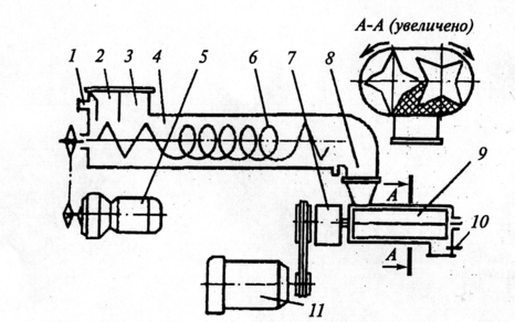 Машина имеет две раздельные камеры: смешения и пластификации. В камере смешения 4 расположены две месильные лопасти 6, на концах которых установлены винтовые шнеки, а между ними – спиральная образующая. Подача муки в камеру смешения производится через патрубок 2, жидких компонентов – через патрубок 1. Патрубок 3 служит для возврата в машину дефектного теста. Привод валов смесителя осуществлен от мотора – редуктора 5 мощностью 2,2 кВт. В конце камеры смешения тесто поступает в переходный патрубок 8 и далее в пластификатор 9, или камеру интенсивной проработки месильными валами, приводимыми во вращение от электродвигателя 11 через редуктор 7. На выходе из камеры установлен термометр 10 для контроля температуры теста.