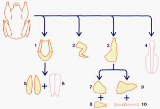 Разрубка птицы. Птицу можно рубить с костями сначала надо отделить ножки и крылья. Чтобы облегчить разрубку, кости следует вывернуть из суставов. Затем при помощи специальных ножниц или ножа разрубить вдоль грудки на 2 части и разрубить каждую половину на порционные куски.