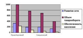 | Районы города | Кол-во предприятий, ед. | Обеспеченность населения, % | Товарооборот, млн. р. | Доля предприятий в розничном товарообороте города, % |