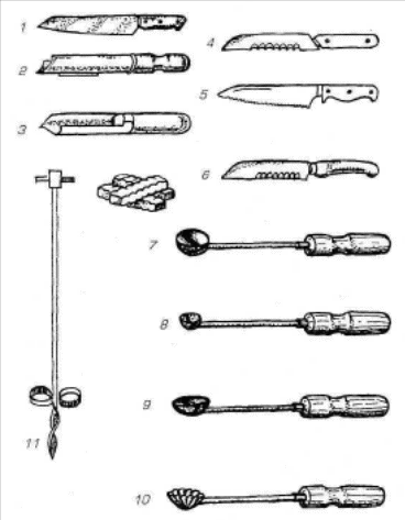 1 – коренчатый нож; 2 – желобковый нож; 3 – нож для доочистки; 4 – нож для нарезки лука; 5 – нож для нарезки помидоров; 6 – гофрированный нож; 7, 8, 9, 10 – фигурные выемки; 11 – приспособление для фигурной нарезки овощей.