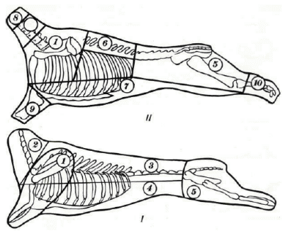 Рис. 3. Схема кулинарной I и торговой II разделки бараней туши: 1 – лопаточная часть; 2 – шейная часть; 3 – корейка с реберной костью; 4 – грудинка с реберной костью; 5 – тазобедренная часть; 6 – спинная часть; 7 – грудная часть пашины; 8 – зарез; 9 – предплечье; 10 задняя голяшка.