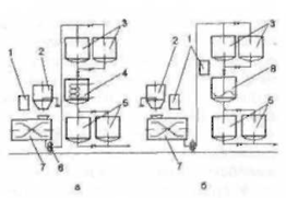 Рис. 6.2. Апаратурна схема приготування рідких дріжджів (а — за першим варіантом, 6 — за другим варіантом): 1 — водомірний бачок, 2 — автоборош-номір, 3 - ємкість для заквашування заварки, 4 — теплообмінник, 5 — ємкість для розмноження дріжджів, 6 — шестеренчастий насос, 7 — заварювальна машини, В — ємкісіь для розведення заквашених заварок