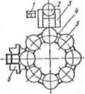 Рис. 6.13. Схема агрегату з машиною РЗ-ХТИ і кільцевим діжевим конвеєром: 1,2 - дозатори відповідно рідких компонентів і борошна, 3 —тістомісильна машина, 4 — кільцевий конвеєр, 5 — діжа, 6 - діжеперекидач