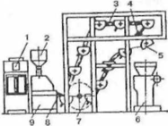 Рис. 6.12. Схема агрегату з машиною РЗ-ХТИ і ланцюговим конвеєром для бродіння: 1,2 — дозатори відповідно рідких компонентів і борошна. З — ланцюговий конвеєр для бродіння, 4 — пристрій для перекидання ємкості, 5,7 — ємкості для бродіння тіста. 6,9 - відповідно тісто-подільна і тістомісильна машина, 8 - лоток
