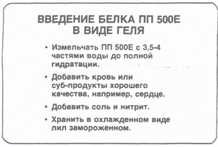 — Гель белка «ПП 500Е», охлажденный, а лучше замороженный, загружают в куттер вместе с мясным и жировым сырьем. По достижении нужного размера частиц сырья добавляют соль, специи и другие ингредиенты, после чего продолжают измельчение в течение небольшого периода времени до достижения соответствующего перемешивания и до нужной степени окончательного измельчения.