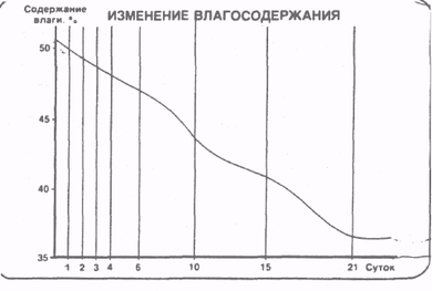 На этой схеме показано, что процесс сушки колбасы происходит почти идеально. Содержание влаги снизилось примерно с 50 до примерно 37% в готовом продукте в течении 21 суток.