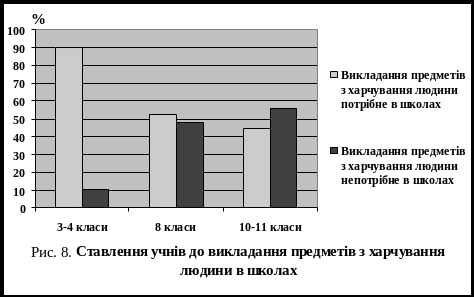 Хоча учні й усвідомлюють важливість правильного харчування, нами виявлена тенденція, що з віком діти виявляють все менше бажання вивчати предмети з харчування людини. Так в 3–4-их класах 90% респондентів заявили, що викладання таких предметів потрібне в школах, а в 10–11-их класах необхідність вивчення такого курсу визнають лише 44% школярів (рис. 8).