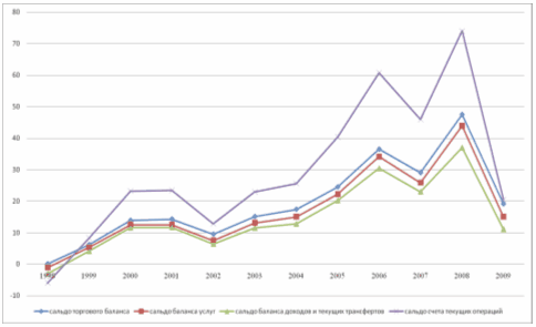 Рисунок 4. Динамика показателей платежного баланса в 1998-2009 г. г. (данные по 1 кварталу каждого года в млрд. руб)