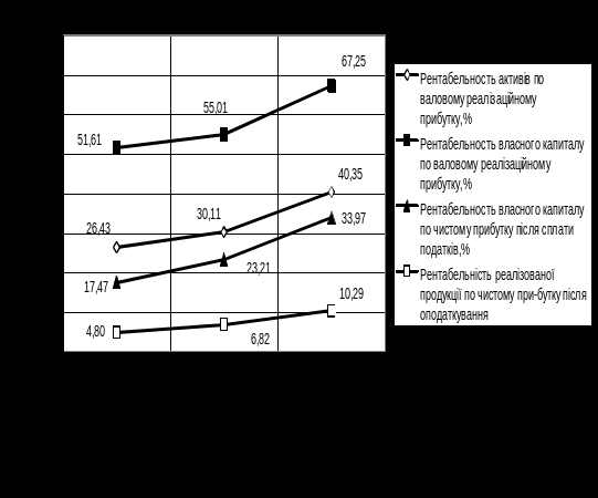 2. Рентабельность активів по валовому реалізаційному прибутку знизилась у 2005 році більш ніж в 2 рази рівня 10,0% (2004) до 4,67% у 2005 році та різко зросла більш ніж в 5 разів до рівня 26,43% у 2006 році.