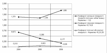 у 2004 - 2006 роках тільки рівень загальної ліквідності (1,3 - 1,7) знаходився в діапазоні, який значно перевищує нормативну (більше 1,0, абсолютно стійкий рівень загальної ліквідності - більше 2,0);