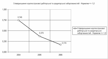 у 2004 - 2006 роках показник відношення короткострокової дебіторської та кредиторської заборгованостей (0,17 - 0,74) був суттєво нижче значення стійкого діапазону (більше 1,0), тому для розрахунків з кредиторами необхідно було не тільки отримати кошти дебіторської заборгованості за відпущені товари, але і реалізувати частину продукції, яка знаходилась в товарних запасах та ще не була продана;