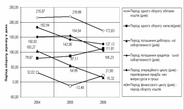 Як показано графіками рис.2.8 у 2006 році відносно 2004 - 2005 року з нарощенням обсягів операцій період обороту запасів балансу підвищився на 30,9%, що підняло відповідно строк фінансового та операційного циклу та свідчить про зниження темпів ділової активності підприємства при нарощенні обсягів діяльності.