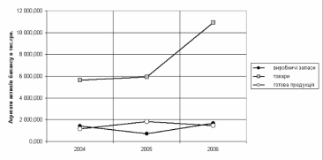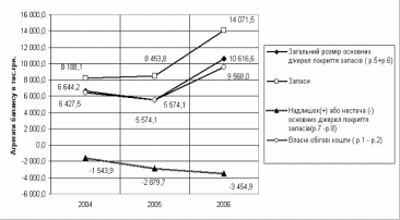 Як видно з графіків рис.2.9 в 2004 - 2006 роках показник фінансової стійкості по покриттю запасів в ТОВ "Рамірент Україна" знаходився в зоні, характеризуємій як "кризовий стан", при цьому в 2006 році за рахунок значного підняття рівня запасів (рис.2.10) підприємство все більше переміщується в зону "кризовий стан" по показнику фінансової стійкості по джерелам покриття запасів, оскільки запаси формуються за рахунок частини кредиторської заборгованості.