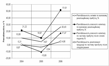 3. Рентабельность активів по валовому реалізаційному прибутку знизилась у 2005 році більш ніж в 2 рази рівня 10,0% (2004) до 4,67% у 2005 році та різко зросла більш ніж в 5 разів до рівня 26,43% у 2006 році.