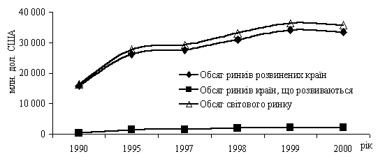 Подібно росту капіталізації світового ринку корпоративних прав, ріст світового ринку боргових інструментів також випереджав ріст реальної економіки. Діаграма, що відбиває динаміку капіталізації ринків облігацій, представлена нижче (рис. 2.6).