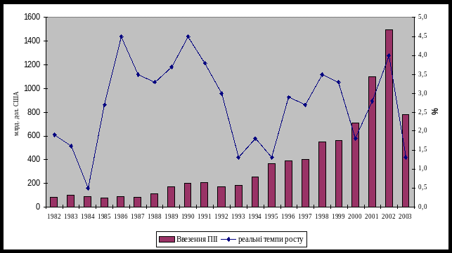 Рис 2.2. Ввезення ПІІ і реальні темпи росту ВВП у світі, 1982-2003 роки