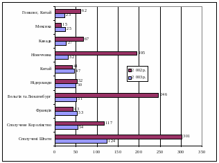 Рис. 2.3. Ввіз ПІІ: 10 головних країн світу, 2002 і 2003 роки (млрд. доларів) [65, с.79]