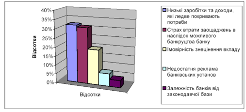 Рис. 2.3 Чинники, які стримують приплив грошових доходів громадян у банки [35]