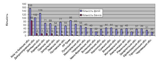 Разом із тим, якщо поглянути на кількість банків та їх філій у розрізі регіонів (рис. 2.2), то бачимо, що фактично кожен регіон характеризується досить високою концентрацією банківських установ, які в основному представлені філіями банків, майже усі головні офіси банківських установ розташовані у м. Київ.